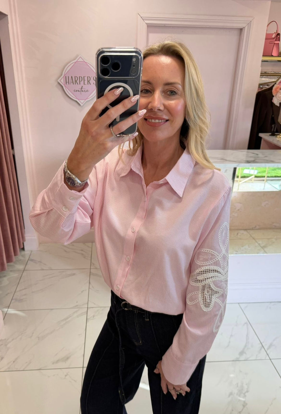 Alba Pink Stripe & Flower Detail Shirt/Blouse